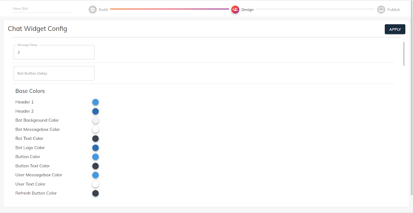 Step 5: After creating the chat flow, move on to the next phase, ‘design.’ Here you can decide the colors, theme, and User Interface and make other modifications to make your chatbot look more appealing.